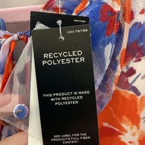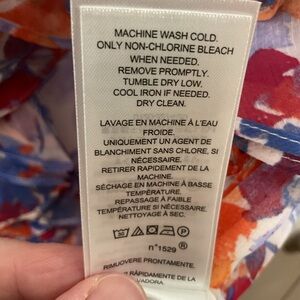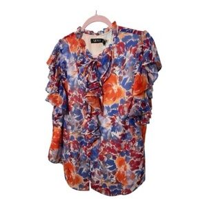 Chic floral blouse with ruffle details. Features vibrant red, blue, and white colors. Perfect for adding elegance to your look.