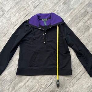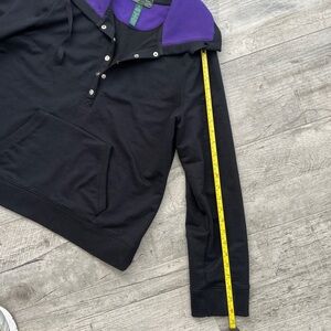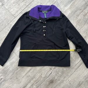 LRL Ralph Lauren pullover hoodie Sz XL. Black body with a vivid purple hood lining. Snap-button placket and front kangaroo pocket. Comfortable casual layering piece.