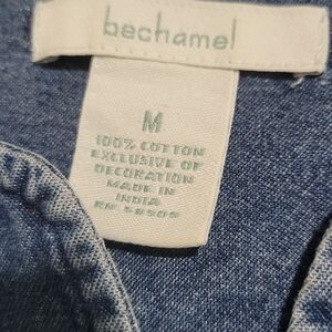 The Bechamel Vintage Denim Embroidered Dress is a knee-length dress for women, featuring a classic blue denim fabric with intricate embroidery accents. This stylish dress is in size M and includes convenient pockets, making it both fashionable and functional. Perfect for a casual day out or a more dressed-up occasion, this dress combines vintage charm with modern style. Absolutely adorable dress in EUC.