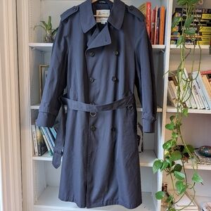 Vintage London Fog navy blue long trench coat / overcoat, double breasted, with plaid inner lining. Timeless and versatile outerwear. Style is preppy, vintage, dark academia, twee, and spring. Size is Large / 42R.