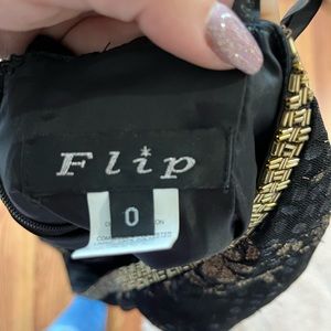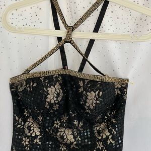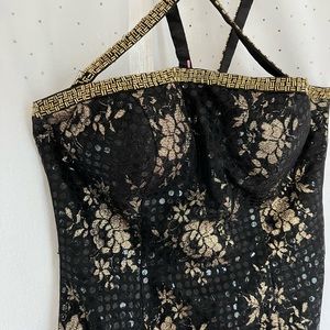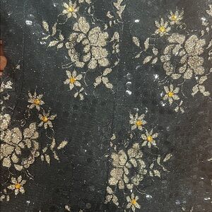 Step out in style with this elegant black and gold floral dress. Perfect for any occasion, this dress combines sophistication with a touch of glamour. Custom topaz stones added throughout the floral pattern. Does have small snag in beading, not noticeable when wearing! Picture showing imperfection and stoning.