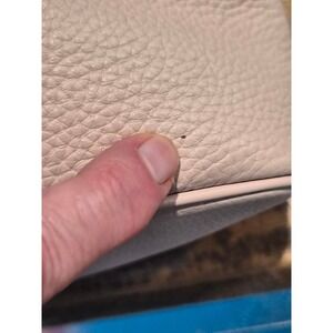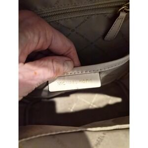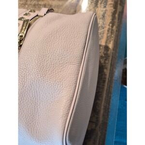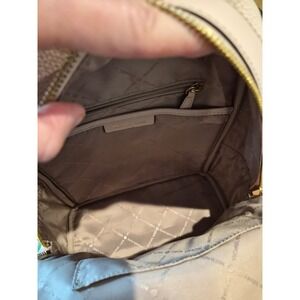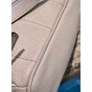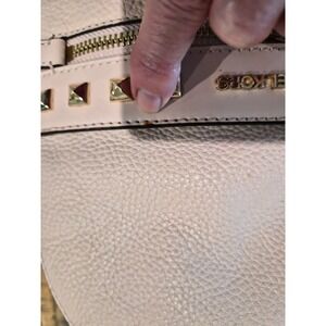 Michael Kors Rhea mini backpack crafted from pebbled leather in a soft ballet pink hue. This stylish bag features a dual-compartment design with gold-tone hardware and signature pyramid stud accents across the front. Adjustable shoulder straps and a top handle provide versatile carrying options, while the quilted back panel adds a touch of texture. Perfect for keeping essentials organized with its multiple zippered pockets and compact silhouette. Note: minor wear on the piping and a small speck on the leather as shown in photos.
