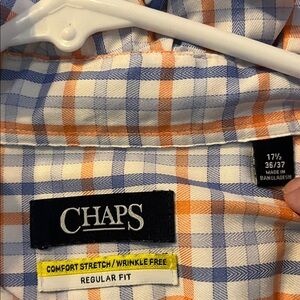 Chaps women's blouse with ruffled stand collar. Lightweight plaid fabric in orange and blue checks. Button-front styling with tailored seaming. Classic, preppy look suitable for layering.