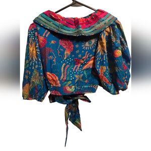 Bold blue crop top with tropical print. Puff sleeves and ruffle-trimmed V-neck. Adjustable tie-front waist