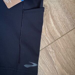 High-rise bike shorts by Brooks. Stretchy, supportive fabric for training. Side pockets on both legs hold essentials. Subtle reflective logo for visibility. Comfortable fit for runs and rides.