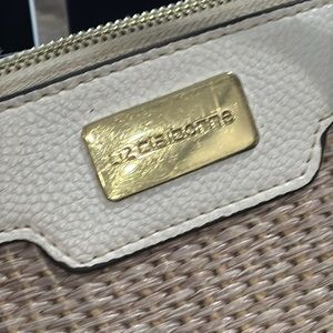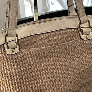Liz Claiborne Woven Straw & Leather Floral Tote Bag Tan Pink
