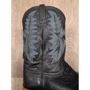 These boots feature a classic western square toe, decorative stitched shaft with teal accents, and traditional pull straps for easy on/off. The boots are finished with stacked leather heels and leather outsoles, giving them an authentic cowboy look and long-lasting wear.