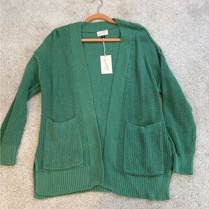 Open-front knit cardigan with large front pockets. Relaxed silhouette for easy layering. Textured knit and ribbed trim on cuffs and hem. Long sleeves for everyday wear.