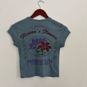 Baby tee with flower market graphics at the front. Hits above the waist in a fitted silhouette with a crew neckline. Finished with a vintage-inspired graphic at the back. 100% Cotton.