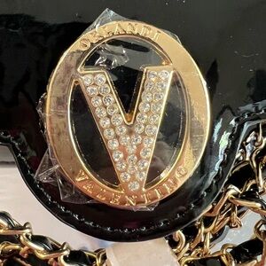 Sleek black patent crossbody with a gold-tone V logo accent. Elegant, polished look for day-to-night wear. Secure magnetic flap closure and versatile strap for hands-free convenience. Stylish black bag that adds a refined touch to any outfit.