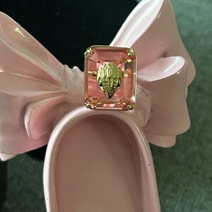 Elegant pink bow ring featuring a large gold-accented gemstone.
