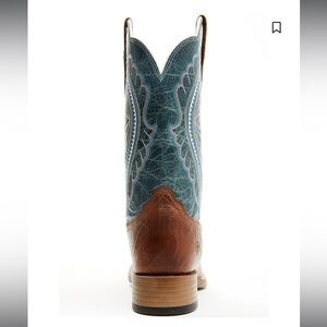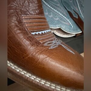 Stylish cowboy boots with a brown leather foot and blue embroidered shaft. Perfect for a western look.