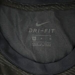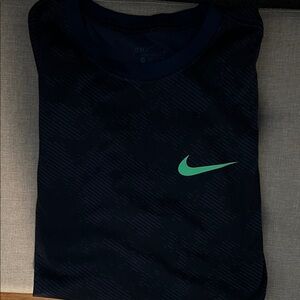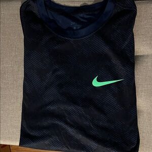 Lightweight Nike Dri-FIT short sleeve tee. Navy base with a bright green Swoosh logo. Breathable fabric for workouts and casual wear. Athletic cut for easy movement.