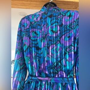 Step back in time with this stunning vintage 80s–90s midi dress by D’Allaird’s. Featuring a bold, artistic abstract print in vibrant shades of blue, purple, and teal , this dress exudes retro charm and elegance.