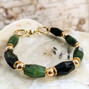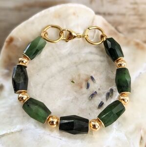 The bracelet is made with natural, true Jade in barrel form. They are Canadian jade.