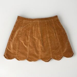 Stylish tan corduroy skirt with button-up front. Features a scalloped hem for a trendy look.
