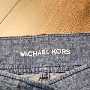 Michael Kors wide-leg chambray jeans. Five-pocket styling with button fly. Soft indigo blue hue and subtle texture. Clean, versatile silhouette.