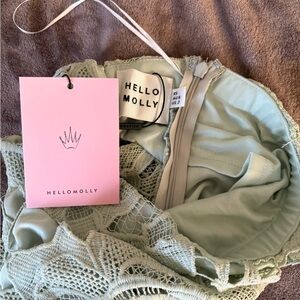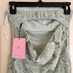 Chic lace midi dress in light green. Features floral lace pattern. Ideal for elegant events.