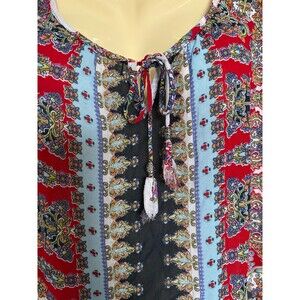 This Y2k Bila beachy Boho L blouse is perfect for a festival or peasant-inspired look, with a floral pattern and tasseled accents giving off a bohemian vibe. Made from rayon fabric, this multicolored blouse features short cap sleeves and a round neckline, making it ideal for casual occasions during the summer and spring seasons. The semi-sheer design adds a touch of vintage charm to the basic style