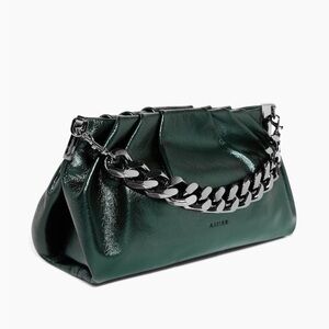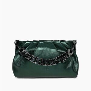 Stylish metallic forest green bag with bold chain strap. This clutch feature beautiful ruched buttery soft leather on a metal frame with a lightweight chain. Perfect for a night on the town.