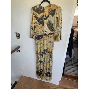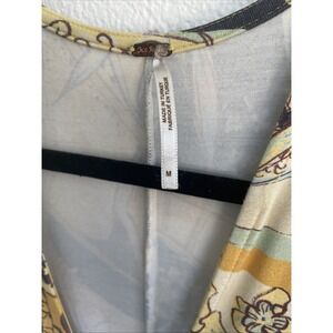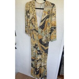 Free People Rare and Hard to find Gold Night Fever Jumpsuit in NWOT Condition! Featuring Lovena design, which can be worn layered with a bodysuit or a Gorgeous Bralette . This wide leg jumpsuit has a zip front closure. It feels like you're wearing a pair of pajamas. It is so comfortable. The print is very retro gold with turquoise and black accents three-quarter length bell sleeve really fun and funky total length of body suit from shoulder to him is 60 inches and fits pit to pit measurement of up to 19 inches. Measurements are approximate the jumpsuit does have stretch size medium.