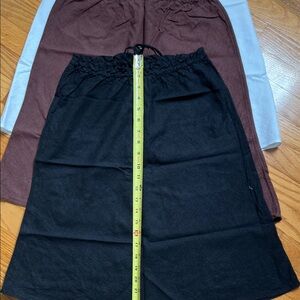 Versatile midi skirt with an elastic drawstring waist for comfortable all-day wear. Lightweight woven fabric for easy movement. Classic black, brown, and white color options to mix and match. Simple, clean silhouette ideal for casual or dressed-up looks.