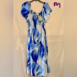 H&M maxi dress in a blue and white abstract print. Scoop neckline with a front tie. Short flutter sleeves. Relaxed, flowing skirt for easy movement. Lightweight fabric perfect for warm days.