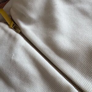 Sleeveless colorblock sheath midi dress by Boden. White bodice with a mustard waist band and navy skirt. Clean, tailored silhouette. Stretch fabric for comfortable wear. Great for work or smart events. Has a few small pulls -can be easily repaired and not very noticeable.