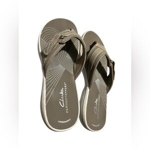 Lightweight Clarks Cloudsteppers sandal. Cushioned footbed for everyday comfort. Adjustable strap for a secure fit. Casual brown tone pairs easily with outfits.