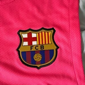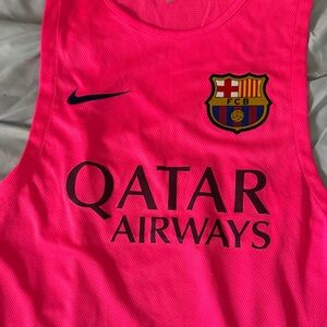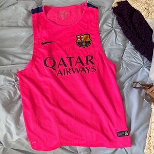 Vibrant pink Barcelona training tank with Nike logo. Features Qatar Airways branding.