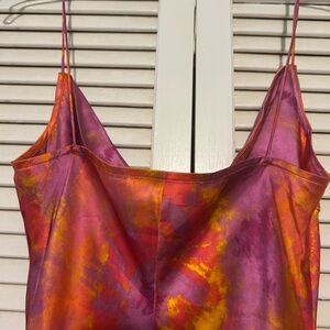 Silk slip maxi with cowl neckline. Thin spaghetti straps. Fitted through the bodice and flows to a sleek hem. Bold tie-dye print in vibrant hues. Perfect for cruise or tropical vacation.