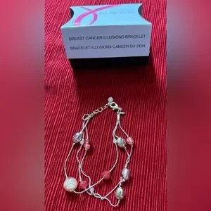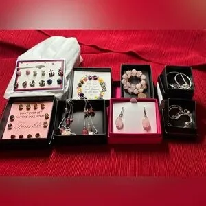 Kohl’s nautical-themed stud earrings, 6 prs; round red & white stripes; round faux pearls; red & silvertone anchors; blue, red, & silvertone sailboats; silvertone anchors; round light blue anchors painted on dark blue background. Avon With Love stud earrings, 5 prs; 2 roses: 1 purple & 1 pink; 1 silvertone daisy with palest pink faux crystal in middle; 2 round faux gems: 1 sparkly pink & 1 faux diamond. Avon Power of Energy stretch bracelet; 21 pink pearly beads & alternating goldtone ringlets; 1 round goldtone charm with tiny faux diamond gems; clear elastic stretchy cord. Avon Sentimental Word HOPE silvertone bracelet; lobster clasp, about 8” with extender; small silvertone chain with round “Hope” silvertone charm in middle. Avon Sparkle On goldtone stud earrings, 6 prs, 6 colors; round sparkly faux gems encased in goldtone base; spring green, light yellow, blue-violet, palest white-blue, ruby red, & dark yellow amber. Avon Illusions silvertone bracelet; 3-strand bracelet made of thin silvertone chains, with pale & bright pink beads & silvertone nugget beads; meant to show a “floating” illusion when worn; lobster clasp, about 8” with extender. Avon Studio 1886 Rose Quartz Drop Earrings; goldtone earrings about 1.5” with fish hook backs; palest pink teardrop-shaped faux beads. Avon Sentimental Word LAUGH silvertone bracelet; lobster clasp, about 8” with extender; small silvertone chain with round “Laugh” silvertone charm in middle. *NO* real gems; only describing the colors.