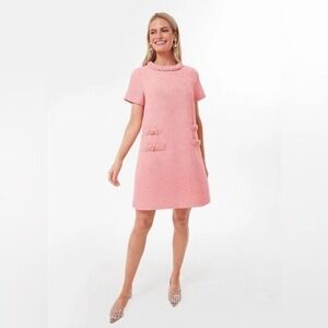 Tuckernuck pink tweed shift dress offers a sophisticated and timeless aesthetic. Crafted from a rich textured bouclé fabric, this mini dress features a braided neckline and matching braided trim on the decorative front pockets, accented by ornate gold-tone buttons. The structured A-line silhouette and short sleeves provide a polished look suitable for garden parties, luncheons, or professional settings. A concealed back zipper ensures a seamless finish, while the full lining provides comfort and a smooth drape.