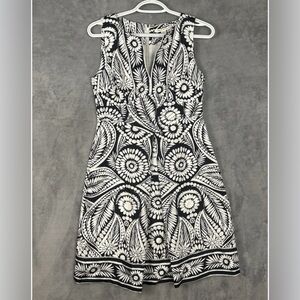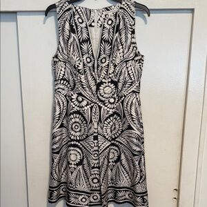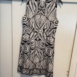 Chic midi dress with intricate black and white patterns. Perfect for stylish outings.