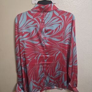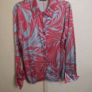 Elevate your wardrobe with this chic women's silk top featuring a vibrant pink and blue design. Perfect for any occasion, this top combines style and comfort effortlessly.