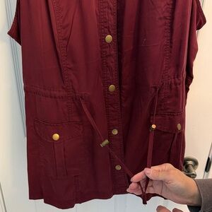 NWOT Sleeveless button-front tunic vest in a deep wine color. Front flap pockets and snap closures for convenient storage. Lightweight, structured fabric for easy layering over tops. Classic collar and clean lines for versatile everyday wear.