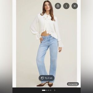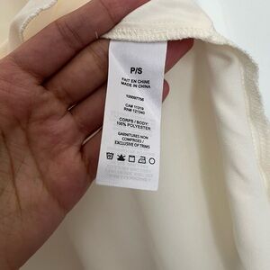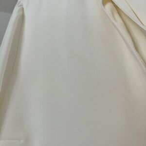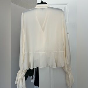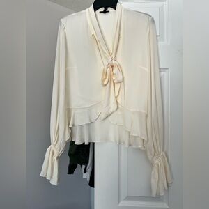 Lightweight cream blouse with a flowing silhouette. Features a tie-neck and soft ruffle hem. Long sleeves with gathered cuffs for subtle detail. Elegant, versatile top for dressy or casual outfits. Has a minor makeup mark on the front, can be washed off with proper care!