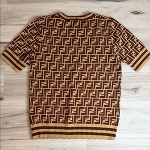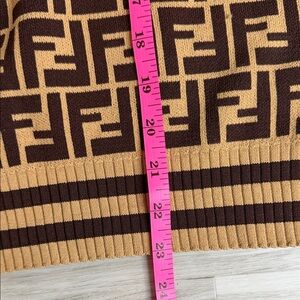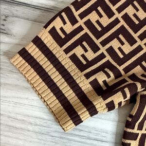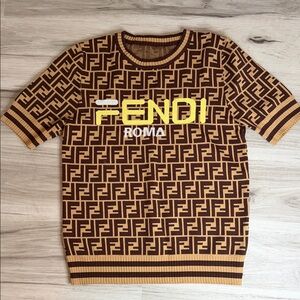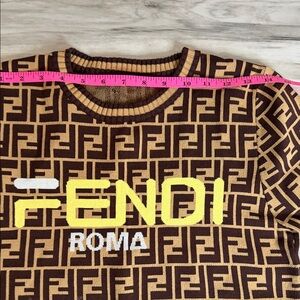 Stylish Fendi sweater with bold logo design. Features brown and yellow colors. Crewneck style for a modern look.
