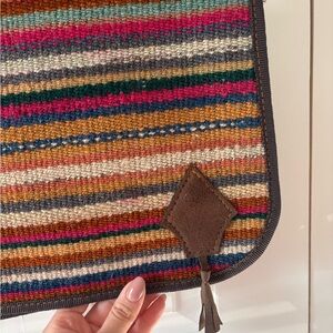 Stylish woven crossbody bag in multicolor stripe pattern. Features a secure flap closure and comfortable shoulder strap. Versatile design perfect for everyday outings and casual looks. The multicolor stripes add a vibrant, playful touch.