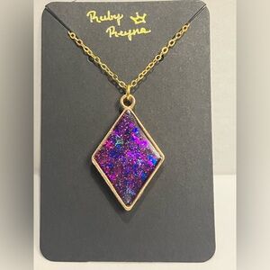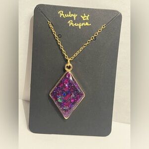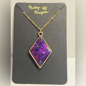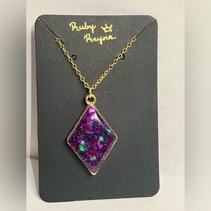 Handmade resin necklace featuring a vibrant purple galaxy-inspired design filled with sparkling glitter and reflective flakes. Each pendant is carefully crafted and set in a gold-tone diamond shaped frame, creating a bold and unique statement piece.