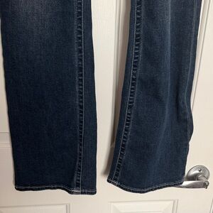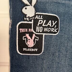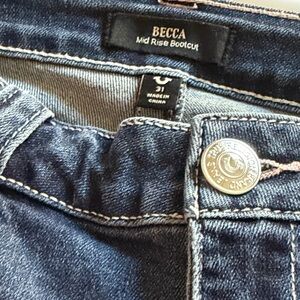 True religion, new, size 31 Becca, mid rise, PLAYBOY bootcut jeans in a dark wash. Features embroidered bunny and logo patch on thigh. Subtle whiskering at front. Pink rivet accents for a pop of color. Classic mid-rise silhouette with slight flare at hem.Measures-waist -34”, Rise- 8”, Inseam-30”. NWOT , PERFECT CONDITION.