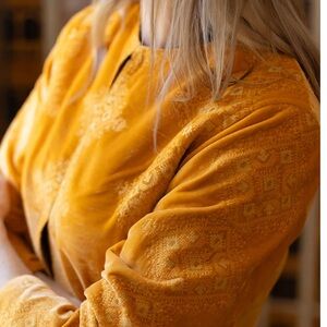 A favorite piece of the designer. Cropped velvet jacket with geometric embroidery. Mandarin collar, open front with two optional hook and eye fasteners. Fully lined.