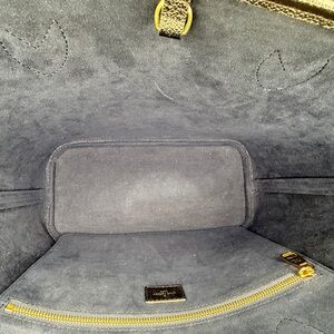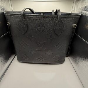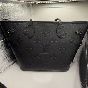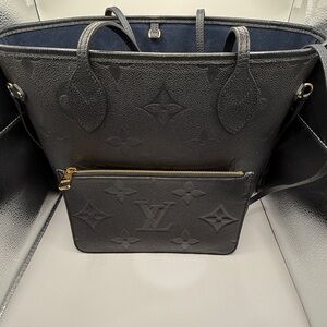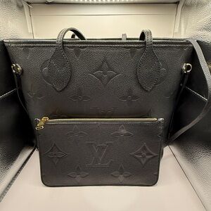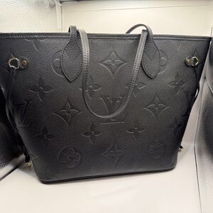 Louis Vuitton structured tote in black embossed monogram leather. Includes matching removable zip pouch with gold-tone zipper. Embossed LV motif across both pieces. Sleek, versatile silhouette for daily wear.