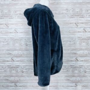 This is a new navy faux fur zip jacket.