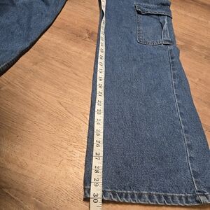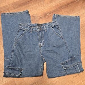 Chic wide leg jeans in blue. Features large side pockets. Perfect for casual wear. jeans are in great used condition, showing minimal signs of wear.