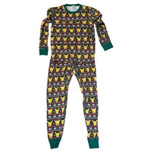 Hanna Andersson Pokemon Pikachu Christmas Pajama Set brings festive cheer with a vibrant Fair Isle inspired print featuring Pikachu in Santa hats, Pokeballs, and lightning bolts. Crafted from soft 100% organic cotton, this two-piece long john set includes a long-sleeve crewneck top and matching slim-fit leggings with ribbed green cuffs. The high-quality knit ensures a cozy, breathable fit perfect for holiday mornings or winter lounging.