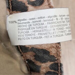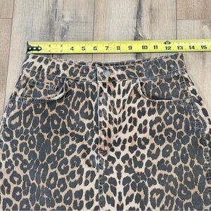 Stylish Zara TRF leopard print denim midi skirt featuring a bold animal print pattern and center front slit for movement and edge. Classic 5-pocket denim design with a flattering high-rise silhouette and structured cotton fabric. Perfect for Y2K core, model-off-duty, streetwear, and retro 2000s aesthetics. Easy to pair with boots, sneakers, or a cropped tee.