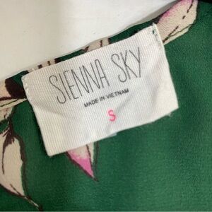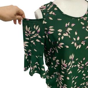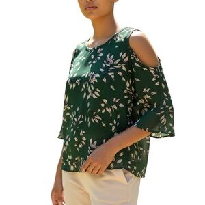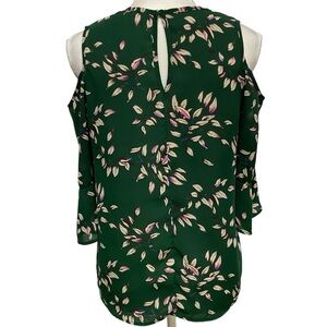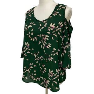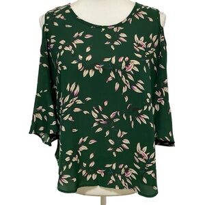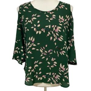 Sienna Sky Top Dark Green Leaf Print Blouse 3/4 Sleeve Cold-Shoulder Size Small