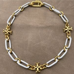 Tory Burch link necklace in polished gold-tone metal and white enamel links. Features decorative cross-shaped charms. Chic contrast and refined detailing. Versatile statement for day or evening wear.