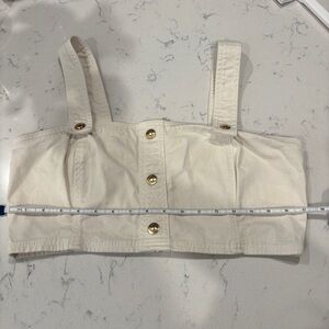 Chic Michael Kors two-piece set featuring a structured cropped top with wide straps and a matching high-waisted button-front mini skirt. Beautiful cream/ivory color with gold tone buttons for a polished, designer look. Perfect for summer outfits, vacations, brunch, or a night out.